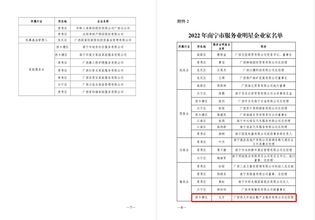 近日,南寧市服務(wù)業(yè)發(fā)展領(lǐng)導(dǎo)小組經(jīng)南寧市政府批準(zhǔn),公布了南寧市服務(wù)業(yè)龍頭企業(yè)名單,認(rèn)定了99家企業(yè)為“南寧市服務(wù)業(yè)龍頭企業(yè)”,分別涵蓋了批零住餐、工程技術(shù)與設(shè)計(jì)服務(wù)、物業(yè)管理、互聯(lián)網(wǎng)和軟件信息技術(shù)服務(wù)等26個(gè)服務(wù)業(yè)行業(yè)領(lǐng)域,認(rèn)定龍頭企業(yè)的負(fù)責(zé)人為“南寧市服務(wù)業(yè)明星企業(yè)家”。廣西西大樸誠(chéng)后勤產(chǎn)業(yè)服務(wù)有限公司(以下簡(jiǎn)稱“樸誠(chéng)后勤公司”)榜上有名,榮獲“南寧市服務(wù)業(yè)龍頭企業(yè)”稱號(hào),公司總經(jīng)理孔宇榮獲“南寧市服務(wù)業(yè)明星企業(yè)家”稱號(hào)。