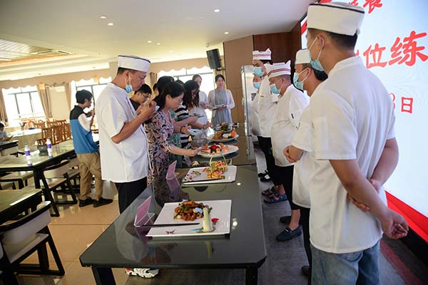 根據(jù)各餐廳售賣模式分別設定不同的烹飪比拼內(nèi)容,大眾餐廳主要以制作相同菜品的大鍋菜為比拼內(nèi)容;接待餐廳以設定食材原料,讓參賽廚師自由發(fā)揮烹制菜肴,通過色、香、味、創(chuàng)新等指標進行評分,評選出各餐廳的“烹飪能手”。