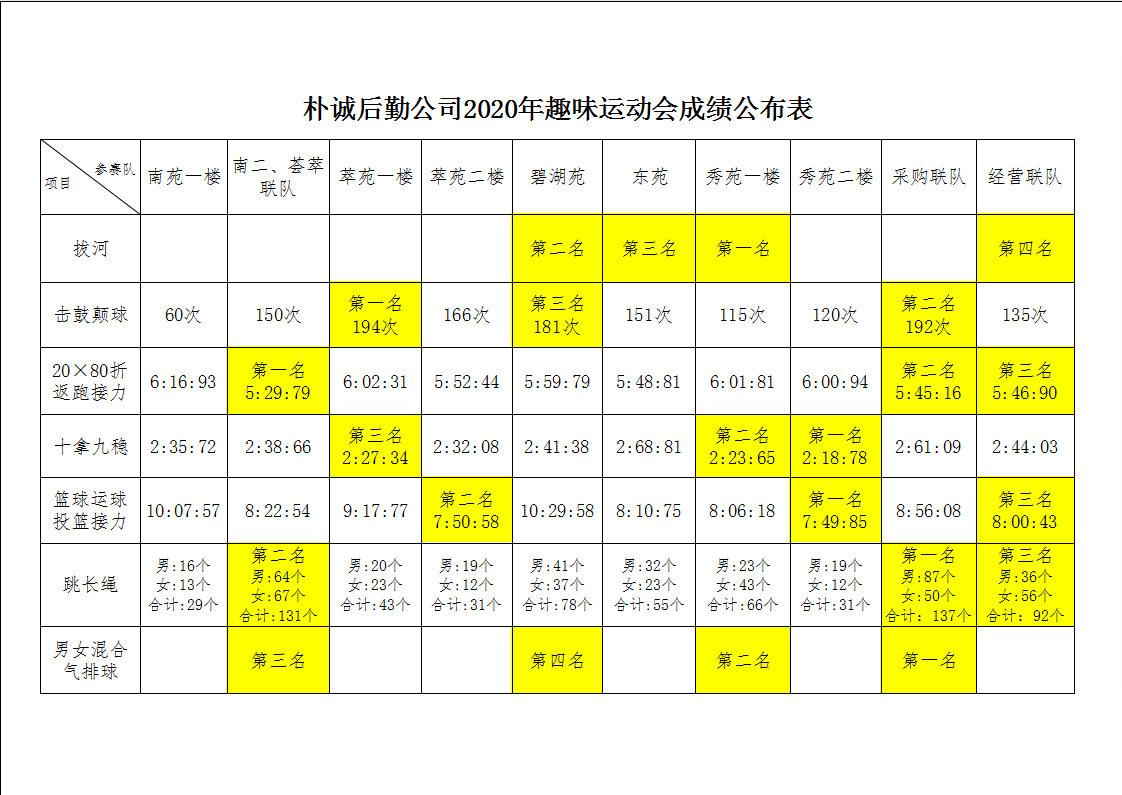 ? 經(jīng)過激烈的比賽角逐,擊鼓顛球、20x80折返跑接力、十拿九穩(wěn)、籃球運(yùn)球投籃接力、跳長繩項(xiàng)目都產(chǎn)生了前三名,拔河和男女混合排球產(chǎn)生了前四名,成績結(jié)果如下圖所示: